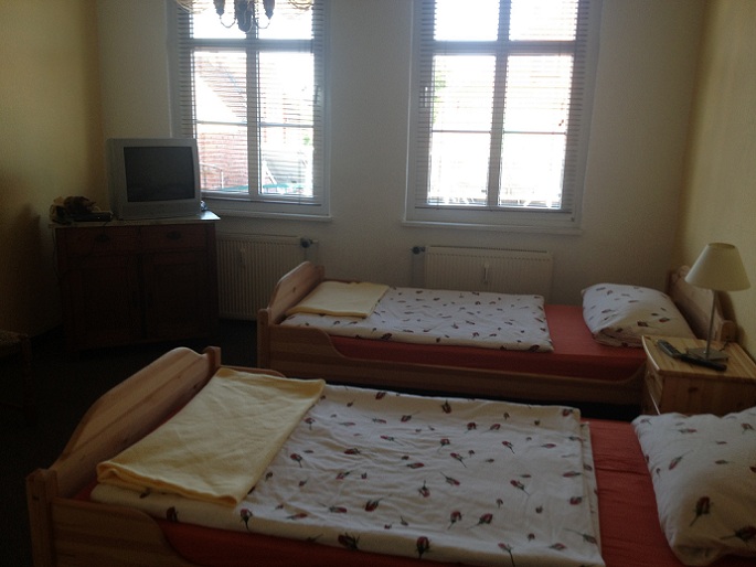 Die Zimmer sind mit Betten, Schrank, Tisch, Stühlen, Fernsehgerät ausgestattet.